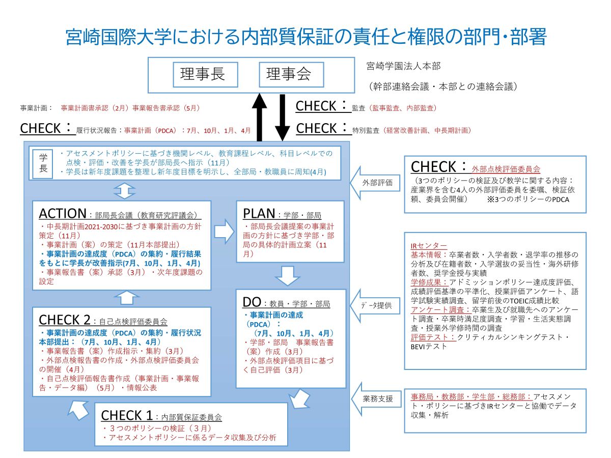 宮崎国際大学は、建学の精神及び使命・目的に沿った人材を養成するため、中長期事業計画をはじめとする各種方針等に則り、教育研究その他諸活動を進める。また、内部質保証として、学長の責任の下、自己点検評価を組織的・計画的に実施し、この結果を基に、質の保証・向上及び社会に対する説明責任を果たしていくための不断の改善・改革を進める。