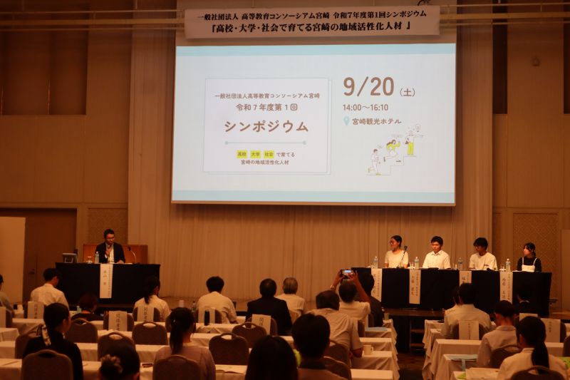 2025年9月20日、宮崎観光ホテルにて一般社団法人高等教育コンソーシアム宮崎の令和7年度第一回シンポジウムが開催され、「高校・大学・社会で育てる宮崎の地域活性化人材」をテーマに、多彩なパネルディスカッションが行われました。会場には大学紹介ブースも設けられ、多くの高校生が着席して参加しました。