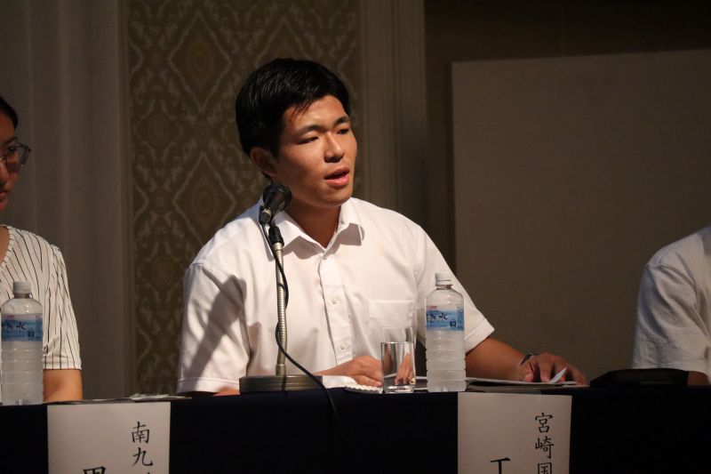 本シンポジウムでは、大学と地域社会が連携して取り組む教育活動の成果が紹介され、教育学部2年生の工藤康太さんがパネリストとして登壇しました。工藤さんは、地域貢献プロジェクト「土呂久に集まれプロジェクト」での活動や学びを発表。地域支援の重要性や実践を通じて得た経験を、堂々としたプレゼンテーションで参加者に伝えました。