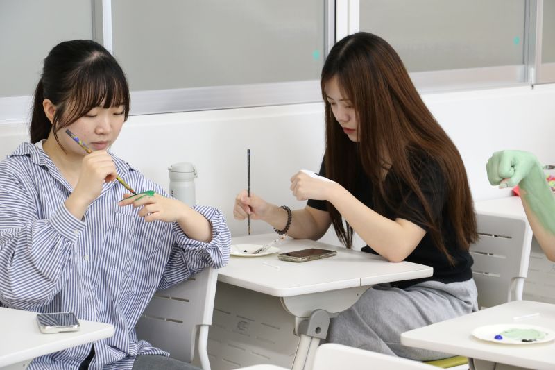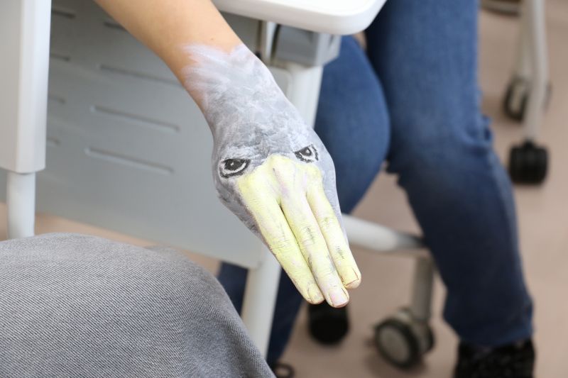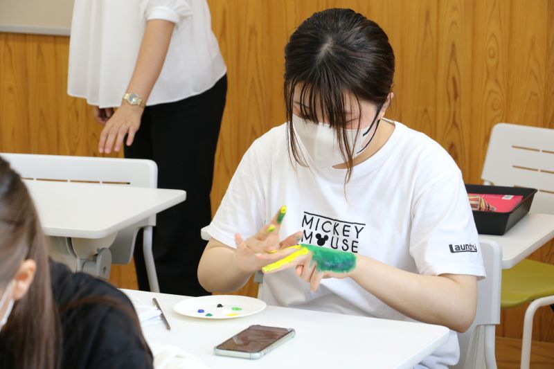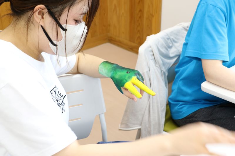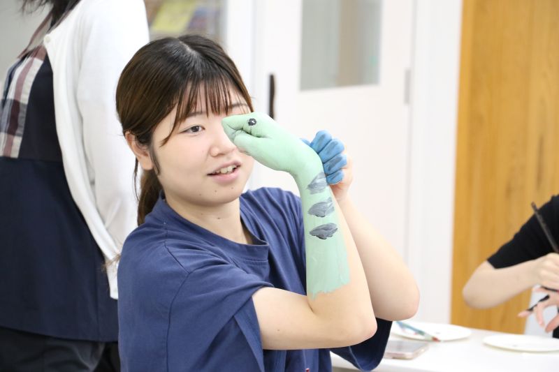 手や腕の形を生き物に見立てて絵の具を塗ることで、立体に色をつける感覚を味わうとともに、絵の具を素肌で感じる体験を通して、素材の持つ特性を五感で楽しみました。こうした体験は、将来、保育の現場で造形活動を行う際に生かすことができる貴重な学びとなりました。