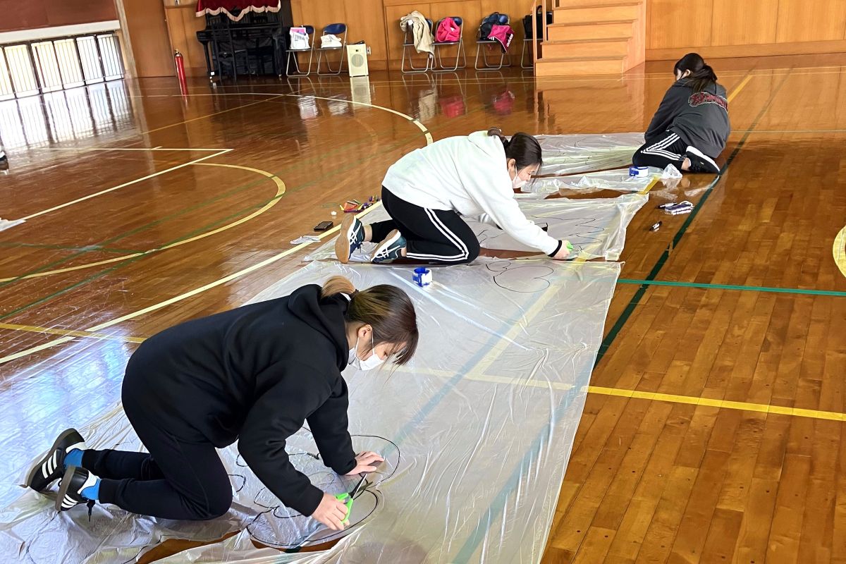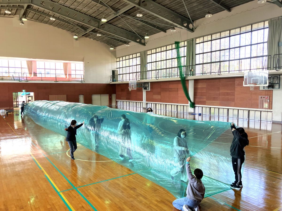 まず挑戦したのは、養生ビニールシートを長くつなげて大きな筒状にする活動。
