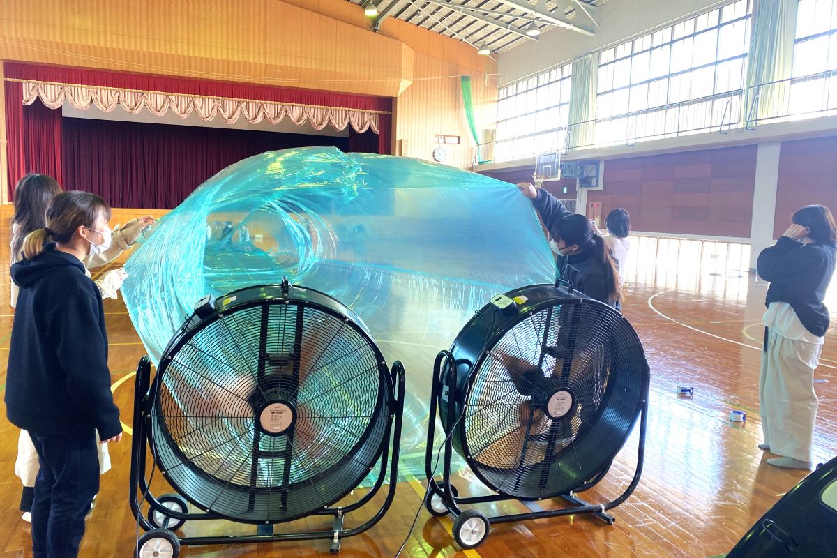 そこへ大型扇風機で風を送り込むと…ふわり、ふくらみ、やがて巨大なトンネルに!